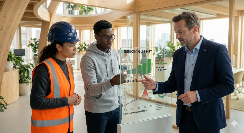 An AI-assisted policy support tool generating evidence-based recommendations for labour, education, and reskilling policies, helping authorities craft fair and efficient strategies during the transition.